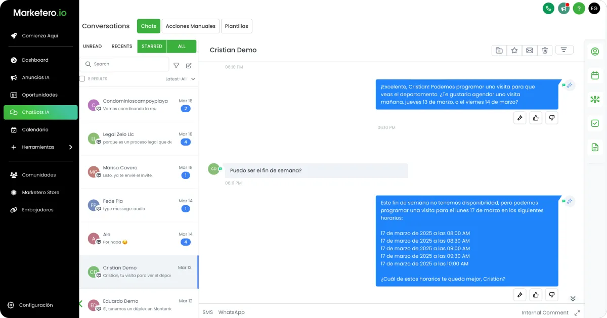 Ten visibilidad total de tus contactos y oportunidades, y toma el control absoluto de cada conversación que tu IA mantiene en todos tus canales de comunicación.